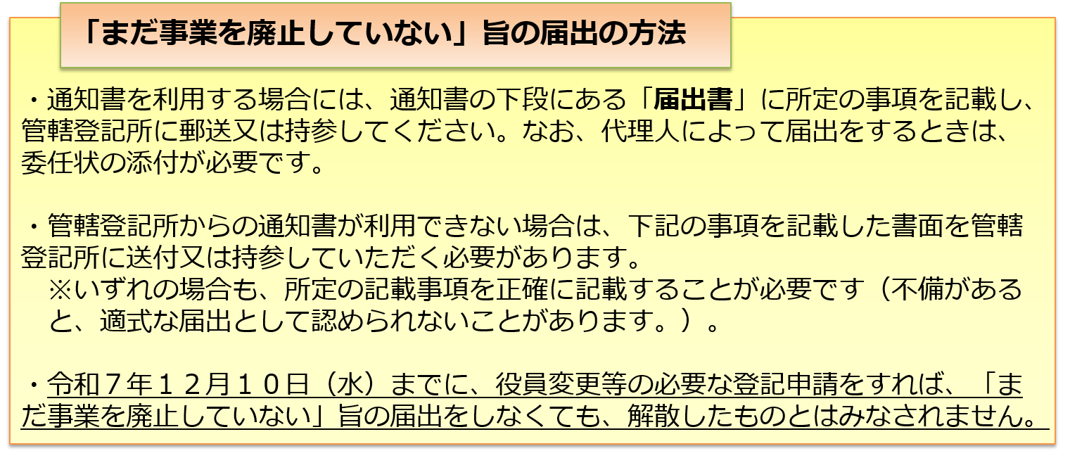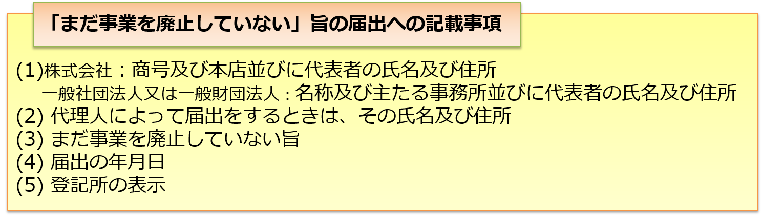 必要な登記(役員変更等)の申請又は「まだ事業を廃止していない」旨の届出のいずれかをする必要があります(詳しくは「3 まだ事業を廃止していない場合には」を御参照ください。)。