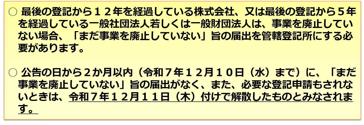 令和7年12月10日(水)までに必要な登記(役員変更等)の申請又は「まだ事業を廃止していない」旨の届出をしない限り、同月11日(木)付けで解散したものとみなされ、管轄登記所の登記官により職権で解散の登記がされますので、御注意ください。